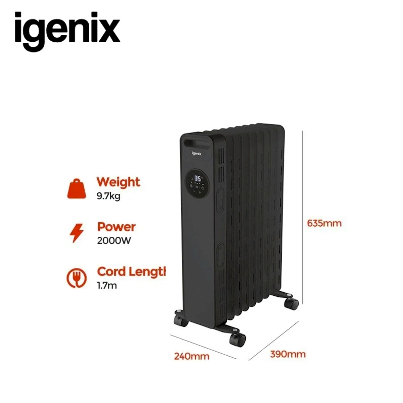 Igenix 2kW Oil Filled Radiator - Remote, Digital Timer (Black) (IG2621BL)